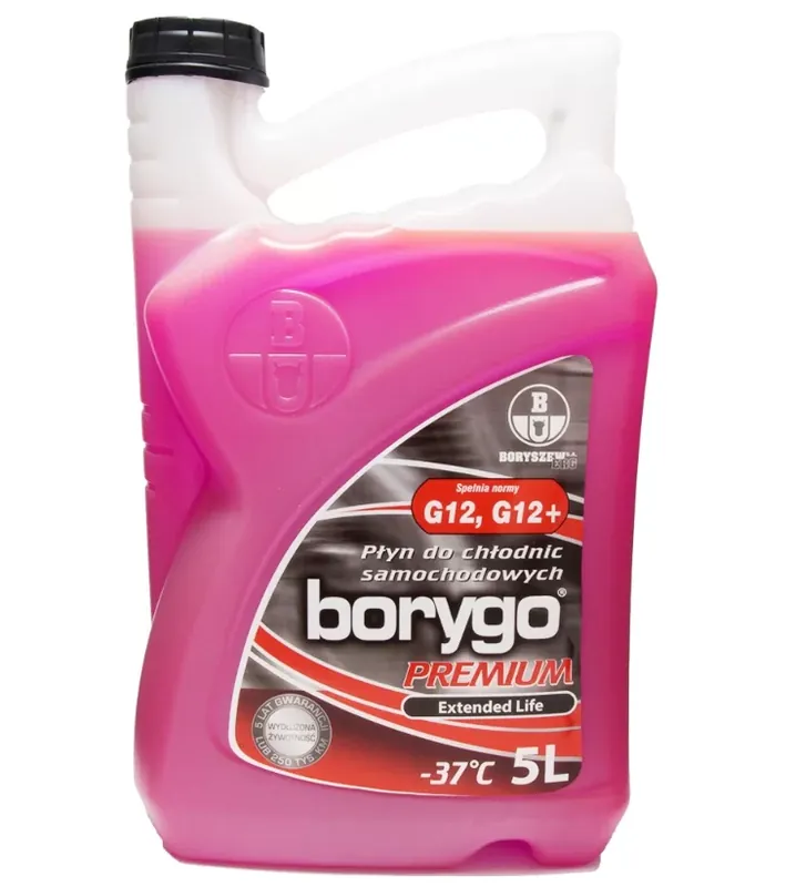 Płyn BORYGO to doskonale znany wielosezonowy płyn do chłodnic samochodowych. Wyprodukowany na bazie glikolu etylenowego owysokiej czystości jest przeznaczony do stosowania wukładach chłodzenia silników samochodów. NORMY: Borygo Premium – płyn obardzo wysokich parametrach użytkowych, spełniający normy G12 iG12+. Jest produktem oprzedłużonej żywotności, zapewnia ochronę układu chłodzenia silnika przezokres 5 lat lub 250 000 km ciągłej eksploatacji. Temperatura zamarzania -37°C gwarantuje pełna ochronę układu chłodzenia wczasie wysokich mrozów wnaszych warunkach klimatycznych. Borygo Premium przeznaczony jest do stosowania wukładach chłodzenia silników spalinowych we wszystkich modelach samochodów wyposażonych wukłady chłodzenia zaluminium, miedzi orazich stopów. Szczególnie zalecany do bardzo nowoczesnych silników spalinowych, wymagających dobrej ochrony podczas eksploatacji samochodu wbardzo trudnych warunkach. Płyn do chłodnic Borygo Premium jest mieszalny zwiększością płynów do chłodnic równie wysokiej jakości, produktowanych zwykorzystaniem glikolu etylenowego.