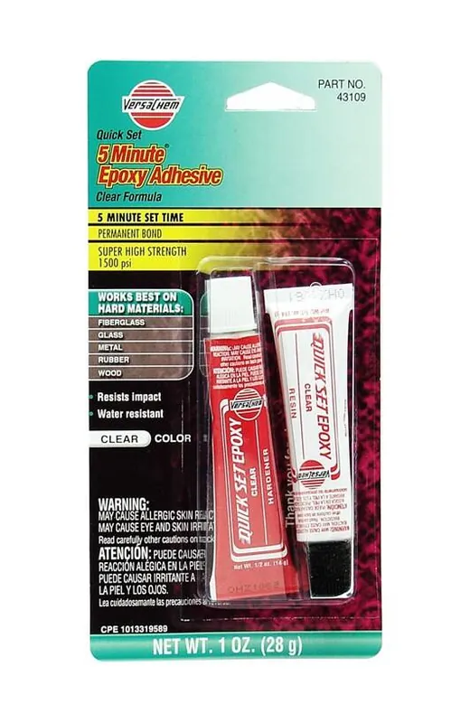 Opis produktu i zastosowanieVersachem 5 Minute Clear Epoxy to dwuskładnikowa, szybko utwardzająca się żywica epoksydowa ogólnego zastosowania, która wysycha bezbarwnie. Ta formuła o wysokiej wytrzymałości tworzy trwałe wiązanie na prawie każdym materiale. Używaj go do łączenia metalu, drewna, chromu, betonu, szkła, ceramiki, włókna szklanego, porcelany i innych materiałów o wytrzymałości na rozciąganie 1500 PSI.Wymieszać tylko taką ilość żywicy i utwardzacza, jaka może być zużyta w czasie obsługi. Możesz mieszać kolorową kredę z żywicą epoksydową, aby naprawić zniszczoną emalię i porcelanę, a także możesz dodać koncentrat kolorowego pigmentu. Należy to zrobić po dokładnym wymieszaniu żywicy i utwardzacza. Dobrze jest użyć usuwalnej taśmy na powierzchniach, na które nie chcesz nakładać się żywicy epoksydowej. Przed utwardzeniem żywicy epoksydowej usuń taśmę.