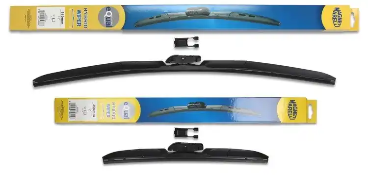 Nowe wycieraczki; zapakowane w oryginalne opakowanie producenta. Cena zakupu dotyczy 1kompletu (strona kierowcy i pasażera). Wycieraczki hybrydowe Magneti Marelli to wyjątkowa konstrukcja i najwyższa jakość materiałów:- Guma – ponad 50% kauczuku naturalnego z grafitową powłoką; wewnątrz gumy podwójna stal nierdzewna.- Złącze – materiał POM (tworzywo termoplastyczne o wysokiej wytrzymałości mechanicznej i odporne na ciepło)- Spojler – materiał ABSWycieraczki montuje się bardzo szybko i sprawnie; obrazkowa instrukcja montażu znajduje się na ich opakowaniu.Zalety wycieraczek hybrydowych Magneti Marelli1.Jeden uniwersalny adapter w wycieraczkach hybrydowych Magneti Marelli znajduje zastosowanie w czterech różnych ramionach wycieraczek, co sprawia, że pasują do większości modeli samochodów.2. Sztywne gumowe pióro z grafitową powłoką w wycieraczce hybrydowej Magneti Marelli zapewnia bardziej skuteczne wycieranie powierzchni szyby.3. Wycieraczki hybrydowe Magneti Marelli dzięki zaawansowanej technologii, mogą zastąpić dotychczasowe tradycyjne wycieraczki w starszych modelach samochodów, a ich wymiana jest szybka i łatwa.4. Wycieraczki hybrydowe Magneti Marelli są odporne na niekorzystne warunki atmosferyczne ; zakres temperatury, w których ich praca odbywa się bez zakłóceń to -25ºC do +50ºC.5. Jakość materiałów użytych do produkcji wycieraczek hybrydowych Magneti Marelli zapewnia ich wytrzymałość oraz cichą pracę.6. Nowoczesny design zastosowany w wycieraczkach hybrydowych Magneti Marelli sprawia, że to jedne z bardziej poszukiwanych wycieraczek na świecie. Jak dbać o wycieraczki:- pamiętaj, aby dbać o gumę wycieraczki usuwając z niej brud, owady itp., które osiadły podczas jej pracy (wykorzystać można do tego łagodny detergent); zapominanie o usuwaniu zanieczyszczeń, może doprowadzić do uszkodzenia gumy wycieraczki- nigdy nie używaj wycieraczek, gdy szyba jest sucha; tarcie gumy po suchej szybie może doprowadzić do szybkiego jej zużycia- jeżeli wycieraczka na szybie podskakuje, może to być oznaką, że ramię wycieraczki jest skrzywione; w takim przypadku należy dokonać jego regulacji- jeżeli planujesz pozostawienie samochodu na słońcu przez kilka dni, ustaw wycieraczki tak, aby nie stykały się z szybą- po wizycie na myjni, pamiętaj, aby zawsze dokładnie oczyścić szybę, ponieważ znajdujący się na niej wosk, może powodować przeskakiwanie wycieraczki- pamiętaj również, aby nie uruchamiać wycieraczek na zamarzniętej szybie; może to bowiem doprowadzić do ich uszkodzenia lub oderwania gumy od mocowania.