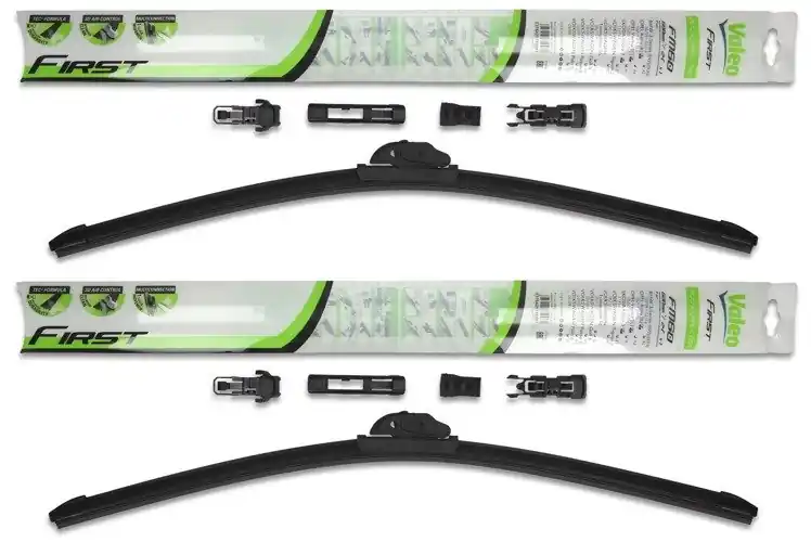 Nowe wycieraczki; zapakowane w oryginalne opakowanie producenta. Cena zakupu dotyczy 1kompletu (strona kierowcy i pasażera).Wycieraczki Valeo First Multiconnection to wysoka jakość i atrakcyjna cena.Bezszkieletowe wycieraczki Valeo First posiadają metalowe listwy, które zapewniają optymalny docisk do powierzchni szyby, a tym samym doskonałą widoczność nawet w niekorzystnych warunkach atmosferycznych.Gumowe pióra wycieraczek wykonane są ze specjalnej mieszanki obrabianego kauczuku, co znacznie poprawia skuteczność czyszczenia powierzchni szyby.Innowacyjny kształt spojlera w technologii „PYRAMID” zapewnia optymalny docisk do powierzchni szyby oraz cichą pracę nawet przy dużych prędkościach.Na opakowaniu wycieraczek First Multiconnection podany jest sposób ich montażu oraz przykładowa lista zastosowań.Wycieraczki First zostały zaprojektowane i wyprodukowane na całkowicie zautomatyzowanych liniach montażowych w nowych fabrykach Valeo.W opakowaniu wycieraczek First Multiconnection znajduje się kilka adapterów. Klient samodzielnie wybiera i montuje właściwy adapter. Zalety wycieraczek Valeo First Multiconnection:- bardzo łatwy montaż- precyzyjne wycieranie szyby- zmniejszenie szumu powietrza poprzez bardziej opływowy kształt- nie zamarzanie zimą poszczególnych elementów wycieraczki- nowoczesny wygląd- spojler na całej długości, poprawiający przyleganie wycieraczki do powierzchni szyby przy dużych prędkościach.Jak dbać o wycieraczki:- pamiętaj, aby dbać o gumę wycieraczki usuwając z niej brud, owady itp., które osiadły podczas jej pracy (wykorzystać można do tego łagodny detergent); zapominanie o usuwaniu zanieczyszczeń, może doprowadzić do uszkodzenia gumy wycieraczki- nigdy nie używaj wycieraczek, gdy szyba jest sucha; tarcie gumy po suchej szybie może doprowadzić do szybkiego jej zużycia- jeżeli wycieraczka na szybie podskakuje, może to być oznaką, że ramię wycieraczki jest skrzywione; w takim przypadku należy dokonać jego regulacji- jeżeli planujesz pozostawienie samochodu na słońcu przez kilka dni, ustaw wycieraczki tak, aby nie stykały się z szybą- po wizycie na myjni, pamiętaj, aby zawsze dokładnie oczyścić szybę, ponieważ znajdujący się na niej wosk, może powodować przeskakiwanie wycieraczki- pamiętaj również, aby nie uruchamiać wycieraczek na zamarzniętej szybie; może to bowiem doprowadzić do ich uszkodzenia lub oderwania gumy od mocowania.