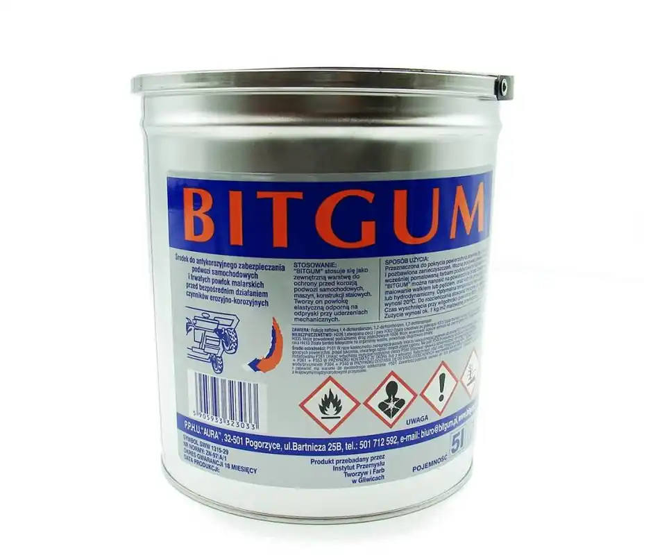 Opis produktu i zastosowanieProdukt do ochrony podwozi samochodowych, maszyn przed korozją i erozyjnym oddziaływaniem czynników mechanicznych oraz zabezpieczania konstrukcji metalowych.Bitgum tworzy powłokę elastyczną odporną na odpryski przy uderzeniach mechanicznych. Przeznaczona do pokrycia powierzchnia powinna być sucha i pozbawiona zanieczyszczeń. Można pokrywać powierzchnię wcześniej pomalowaną farbami podkładowymi lub lakierami.Bitgum można nanosić na powierzchnię poprzez zanurzenie, malowanie wałkiem lub pędzlem, natrysk pneumatyczny lub hydrodynamiczny. Optymalna temperatura nanoszenia wynosi 20 °C. Do rozcieńczania stosować benzynę do lakierów.