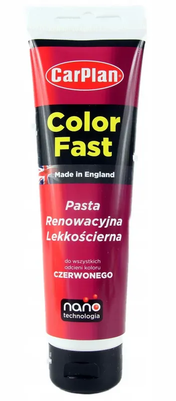 CARPLAN T-CUT NANO 150G NA RYSY KOLOR CZERWONY Innowacyjny produkt łączący wsobie technologię usuwania rys zastosowaną wprodukcie T-Cut Scratch Remover ztechnologią wydobywania głębi koloru użytą wrenomowanym produkcie T-Cut Color Fast. Pasta występuje w6 najbardziej popularnych kolorach : czerwonym, czarnym, białym isrebrnym. Właściwości : formuła pasty wykorzystuje nanotechnologię pozwalając łatwiej usuwać drobne rysy, zmatowienia iprzebarwienia orazmaskować większe ubytki kolorowe pigmenty zawarte wprodukcie współgrają zkażdym odcieniem białego koloru – czyszcząc iusuwając utlenione warstwy lakieru tworzą doskonałe, kolorystycznie dopasowane wykończenie Sposób użycia : niewielką ilość pasty nakładać na czyszczoną powierzchnię okrężnymi ruchami wcierać pastę do momentu zniknięcia rysy usunąć resztki środka zanim wyschnie Zalecenia producenta : przed zastosowaniem należy przetestować działanie pasty na małej powierzchni nie stosować preparatu jeżeli wierzchnia warstwa lakieru jest uszkodzona przy polerowaniu należy uważać aby niezetrzeć zbyt dużej warstwy lakieru unikać mocnego polerowania na krawędziach nie stosować na nowych, błyszczących powierzchniach aby nabłyszczyć karoserię zaleca się nałożenie woskuT-Cut Color Fast Opakowanie : tubka 150g