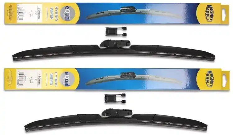Wycieraczki są nowe – w oryginalnym opakowaniu producenta – cena zakupu dotyczy 1-kompletu (odpowiednio dobrane długości i modele wycieraczek – strona kierowcy oraz pasażera).  Wycieraczki hybrydowe Magneti Marelli wyprodukowane są z materiałów o najwyższej jakości:- guma – to ponad 50% kauczuku naturalnego z grafitową powłoką. Wewnątrz gumy znajduje się podwójna stal nierdzewna. Sztywne gumowe pióro z grafitową powłoką w wycieraczkach hybrydowych Magneti Marelli to skuteczne i dokładne wycieranie powierzchni szyby.- Spojler – materiał ABS- Złącze – materiał POMWycieraczki hybrydowe Magneti Marelli dzięki zastosowaniu materiałów najwyższej jakości oraz zaawansowanej technologii, bez problemu zastępują tradycyjne wycieraczki w starszych modelach samochodów. Wymiana wycieraczek jest łatwa i szybka.Wysokiej jakości materiał użyty w wycieraczkach hybrydowych Magneti Marelli sprawia, że są wytrzymałe, dobrze dopasowują się do powierzchni szyby, dzięki czemu ich praca jest cicha. Sprawdzają się również w niekorzystnych warunkach atmosferycznych; temperatura od – 25ºC do + 50ºC w żaden sposób nie zakłóca ich pracy.Wycieraczki hybrydowe Magneti Marelli pasują do większości modeli samochodów dzięki zastosowaniu jednego uniwersalnego adaptera, który może być montowany w czterech różnych wycieraczkach.Wycieraczki Magneti Marelli to jedne z bardziej poszukiwanych wycieraczek na świecie.