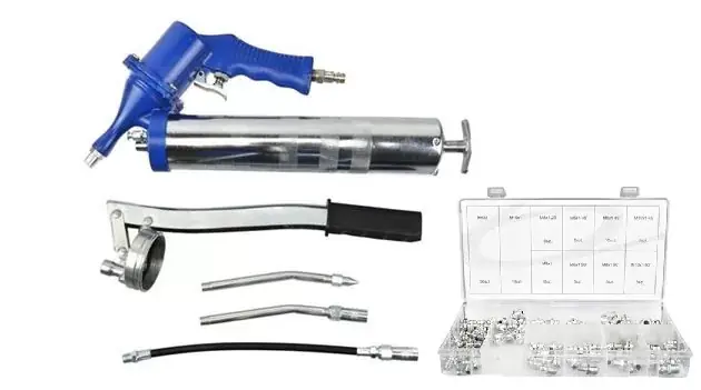 Zestaw zawiera: 1. GEKO SMAROWNICA / TAWOTNICA PNEUMATYCZNO-RĘCZNA 2. GEKO ZESTAW KALAMITEK 110 ELEMENTÓW DO TOWOTNICY GEKO SMAROWNICA / TAWOTNICA PNEUMATYCZNO-RĘCZNA Smarownica pneumatyczno-ręczna przeznaczona do prac warsztatowych gdzie wymagana jest precyzja idokładność. Końcówki smarownicy pasują do standardowych kalamitek. Zbiornik opojemności 400ml, zaopatrzony wzawór odpowietrzający iodprężający. Cechy produktu: wymienne głowice – ręczna dźwigniowa ipneumatyczna uszczelnienie tłoka odporne na smar iolej ergonomiczna ibezpieczna dźwignia ciśnienie robocze: 2 – 6 bar pojemność 400 ml Elementy zestawu: 2x końcówka smarownicza 4-szczękowa końcówka spiczasta wężyk giętki 9×200 mm 2x rurka smarownicza zagięta 150 mm Kod produktu: G01126 GEKO ZESTAW KALAMITEK 110 ELEMENTÓW DO TOWOTNICY 110 – elementowy zestaw stalowych kalamitek. Idealne do stosowania zręcznymi ihydraulicznymi smarownicami / towotnicami. Charakterystyka produktu: Kalamitki wrozmiarach M6 – M10: proste, 45° oraz90°110 sztuk wzestawie Pojemnik ztworzywa sztucznego zpraktyczymi przegródkami Zawartość zestawu: 50 sztuk – M6 x 1,00 10 sztuk – M8 x 1,00 5 sztuk – M8 x 1,25 10 sztuk – M10 x 1,00 5 sztuk – M6 x 1,00 45° 10 sztuk – M8 x 1,00 45° 5 sztuk – M10 x 1,00 45° 5 sztuk – M6 x 1,00 90° 5 sztuk – M8 x 1,00 90° 5 sztuk – M10 x 1,00 90° Kod produktu: G02920