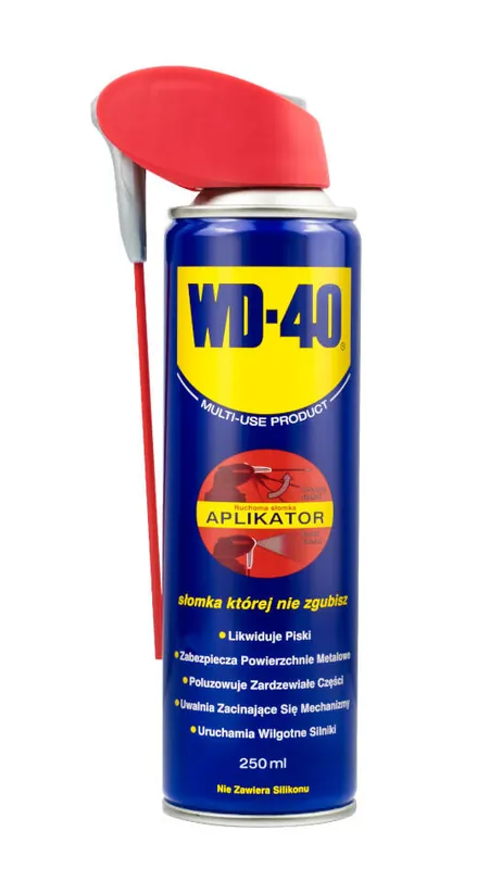 Opis produktu i zastosowanieWD-40 to wielofunkcyjny preparat, który: czyści i konserwuje, likwiduje skrzypienia i piski, usuwa wodę, poluzowuje zardzewiałe części, uwalnia zacinające się mechanizmy, zabezpiecza metalowe powierzchnie przed korozją. Nie zawiera silikonu.To unikalny system dozowania z zamocowaną na stałe „słomką” jako częścią dozownika o podwójnym działaniu umożliwiającym rozpylanie preparatu w dwojaki sposób. Za pomocą nowego systemu dozowania, można rozpylać preparat szerokim strumieniem, bądź też precyzyjnie aplikować go w trudno dostępne miejsca.