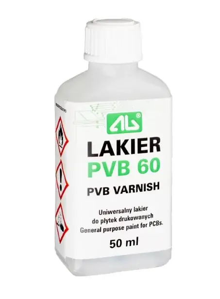 Uniwersalny lakier do płytek drukowanych.Szybkoschnąca przezroczysta powłoka PVB odobrych właściwościach izolacyjnych. Zabezpiecza przed korozją płytki drukowane iinne elementy pracujące wniesprzyjających warunkach atmosferycznych. Powłoka chroni płytki drukowane przed powstawaniem prądów błądzących izwarć. Izoluje izabezpiecza szeroko pojętą elektronikę, płytki drukowane, kable iprzewody, transformatory wysokiego napięcia, zwoje silników elektrycznych. Zastosowanie: -w motoryzacji wcelu uniknięcia spięć izwarć. -uszczelnia plastikowe obudowy wtyczek igniazdek -w energetyce ielektromechanice tworzy warstwy ochronne Właściwości: Tworzy zabezpieczającą iizolującą warstwę chroniącą przed wpływami atmosferycznymi takimi jak: wilgoć, utlenianie, pyły, zanieczyszczenia chemiczne; Dobrze przylega do powierzchni metalowych, plastikowych idrewna; Tworzy powłokę odporną na rozcieńczone kwasy, alkalia iczynniki atmosferyczne; Możliwe jest lutowanie przezwarstwę lakieru; Zapobiega iskrzeniu iwyładowaniom koronowym; Ogranicza przebicia miedzy ścieżkami; Nie zmienia przejrzystości ielastyczności nawet po długim czasie; Zakres temperatur stosowania: od -40°C +60°C. Temperatura pracy -50°C – 150°C. Temperatura zapłonu – 380°C. Magazynowanie: Przechowywać wdobrze wentylowanym miejscu odpowiadającym obowiązującym przepisom wzakresie bezpieczeństwa iochrony przeciwpożarowej – magazyn ognioodporny, bez ogrzewania, instalacja elektryczna iwentylacyjna przeciwwybuchowa, podłoga zwykładziną elektroprzewodzącą; metalowe urządzenia iwyposażenie magazynów, zbiorniki, opakowania itp., na których mogą się gromadzić ładunki elektryczne powinny być uziemione. Przechowywać zdala od dzieci.