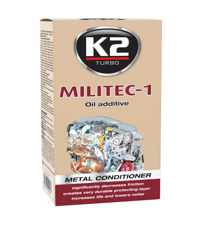 Opis produktu i zastosowanieMILITEC-1 to renomowany amerykański produkt, stosowany na całym świecie od ponad 20 lat. Jest wykorzystywany i testowany w ekstremalnych warunkach przez armię amerykańską m.in. do smarowania silników pojazdów bojowych oraz do czyszczenia broni. Wyjątkowo wysoką skuteczność działania MILITEC-1 potwierdzają setki tysięcy zadowolonych klientów i niezależne laboratoria badawcze na całym świecie. W Polsce badania takie zostały wykonane przez Prof. Labera na Uniwersyteckim Wydziale Mechanicznym Instytutu Budowy i Eksploatacji Maszyn.Militec-1 jest w 100% syntetycznym dodatkiem do oleju produkowanym w oparciu o najbardziej zaawansowaną technologię nanocząsteczek. Czynne składniki produktu działają bezpośrednio na części metalowe tworząc wiązanie na poziomie molekularnym i przenikają do przestrzeni międzykrystalicznej warstw powierzchniowych trących elementów. W wyniku powyższej reakcji na współpracujących ze sobą elementach tworzy się bardzo cienka i niezwykle trwała warstwa ochronna. Militec-1 nie zawiera żadnych potencjalnie szkodliwych stałych elementów, nie zmienia właściwości elastycznych metalu. Przyczynia się do znacznego wydłużenia trwałości mechanizmów. Militec-1 jest mieszalny ze wszystkimi olejami silnikowymi, przekładniowymi, hydraulicznymi niezależnie od ich lepkości i klasy jakości. Bardzo dobrze miesza się z etyliną oraz naftą. Raz dodany Militec-1 do silnika pozostaje wewnątrz na dłużej, tym samym chroni silnik mimo regularnej wymiany oleju zgodnie z instrukcją obsługi samochodu. Może być stosowany w silnikach z mokrym sprzęgłem.Korzyści z zastosowania Militec-1:Zmniejsza tarcie oraz zwiększa warstwę ochronną współpracujących elementów prowadząc do wydłużenia żywotności silnika.Modyfikuje własności powierzchni trących, tworząc trwałą warstwę zabezpieczającą silnik podczas rozruchu. Eliminując do minimum skutki krytycznej fazy rozruchu zimnego silnika.Obniża wytwarzanie ciepła pomiędzy metalowymi częściami.Pełna i ciągła maksymalna ochrona współpracujących części.Chroni przed substancjami kwaśnymi, nagarami itp.Sposób użycia:Militec-1 należy stosować w poniższych proporcjach:Silniki benzynowe oraz Diesla: 50 ml na 1 litr oleju powtarzać co 20.000 kmManualne skrzynie biegów: 60 ml na 1 litr oleju powtarzać co 50.000 kmAutomatyczne skrzynie biegów: 50 ml na 1 litr oleju powtarzać co 50.000 kmDyferencjały: 60 ml na 1 litr oleju powtarzać co 50.000 kmPrzekładnie kierownicze: 50 ml na 1 litr oleju powtarzać co 50.000 kmSystemy Klimatyzacji samochodowej: 5-10 ml przy każdej wymianie środka smarnegoSilniki dwusuwowe: 40 ml na 1 litr oleju, który będzie mieszalny z benzynąŁożyska kół: nałożyć cienką warstwę przed smarowaniemKompresory: 30ml na 1 litr smaru podstawowego, powtórzyć przy każdej wymianie lub po 1000 godzin pracyUrządzenie chłodnicze – klimatyzatory: 8ml na 1 litr czynnika chłodniczegoMaszyny hydrauliczne (wózki widłowe, podnośniki itp.): 250 ml na 20 litrów płynu hydraulicznego po każdym 1000 godzin pracyBroń palna: Należy rozebrać oraz wyczyścić lufę i całą konstrukcję za pomocą rozpuszczalnika odtłuszczającego(po pierwszym użyciu MILITEC-1 nie trzeba będzie już powtarzać odtłuszczenia). Posmarować preparatem wnętrze lufy i wszystkie inne części metalowe. Po kilku strzałach wytrzeć broń do sucha. MILITEC-1 zmniejsza tarcie i zużycie konstrukcji, zapobiega osadzaniu się sadzy, ołowiu i innych zanieczyszczeń, podnosi prędkość postępową pocisku z lufy oraz poprawia celność strzału. Proces smarowania należy powtórzyć po około 1000 strzałach.