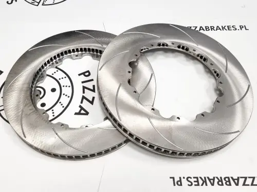 Tarcze hamulcowe (rotory) 370x32mm Rotory na zmianę do tarcz pływających lub skręcanych naszej produkcji. Są to tarcze 2-częściowe, do montażu wymagany jest oryginalny dzwon z zestawu i śruby.Istnieje możliwość wykonania dzwonu tarcz pod dowolny model samochodu do konstrukcji tak zwanego Big Brake Kitu lub jako zamiennik do tarcz 1-częściowych o tych samych wymiarach – w tym celu prosimy o kontakt aby ustalić szczegóły.Wymiary:średnica 370mmGrubość max/min 32/30mmIlość śrub – 12Waga – 8.95 kgTarcze nacinaneWentylacja kierunkowa zakrzywione kanały chłodzące (tarcza prawa i lewa)Podana cena jest za komplet tarcz (2 sztuki) – bez dzwonów i śrub montażowych.