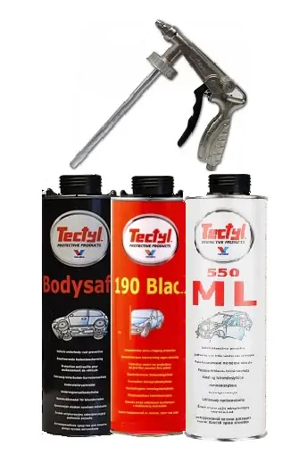 Zestaw zawiera: 1x VALVOLINE BODYSAFE DO KONSERWACJI PODWOZIA 1x VALVOLINE TECTYL 190 DO OCHRONY KAROSERII 1x VALVOLINE ML DO KONSERWACJI PROFILI ZAMKNIETYCH 1x PISTOLET PROF. DO KONSERWACJI/BARANKA Z REGULACJĄ VALVOLINE TECTYL BODYSAFE Łącząc się zmetalem chroni przed agresywnym oddziaływaniem wilgoci izwiązków soli. Tectyl Bodysafe został specjalnie opracowany jako bardzo skuteczna bariera przeciw szkodliwemu działaniu korozji, uderzeń kamieni iotarć. Doskonały do ochrony zbiorników iprzewodów paliwowych, hamulcowych przewodów bezpieczeństwa ihydraulicznych przewodów hamulcowych. VALVOLINE TECTYL 190 Tectyl 190 ochrona przed korozją iścieraniem podwozia samochodów osobowych, ciężarowych, przyczep itp. Szybko schnie imożna po nim malować. Środek oparty na gumie iżywicy. Tworzy mocną, elastyczną itrwałą powłokę ochronną tzw. „baranek”. VALVOLINE ML Jest woskowym, rozpuszczalnikowym środkiem antykorozyjnym koloru bursztynowego. Posiada dobre właściwości wypierania wody, bardzo dobre właściwości penetracyjne, specjalnie opracowany do ochrony antykorozyjnej wewnętrznych powierzchni drzwi samochodowych orazinnego typu przestrzeni zamkniętych pojazdów samochodowych. Po utwardzeniu pozostawia woskową, półprzeźroczystą powłokę koloru bursztynowego. PISTOLET PROF. DO KONSERWACJI/BARANKA Z REGULACJĄ Pistolet przeznaczony jest do nakładania środków konserwacji antykorozyjnej karoserii ipodwozi samochodowych ztypowych 1-, lub 2-litrowych puszek zgwintem (do tzw. ''baranka''). Pistolet posiada ciśnieniowo odlewany korpus aluminiowy, oraz samocentrującą chromowo-molibdenową dyszę.