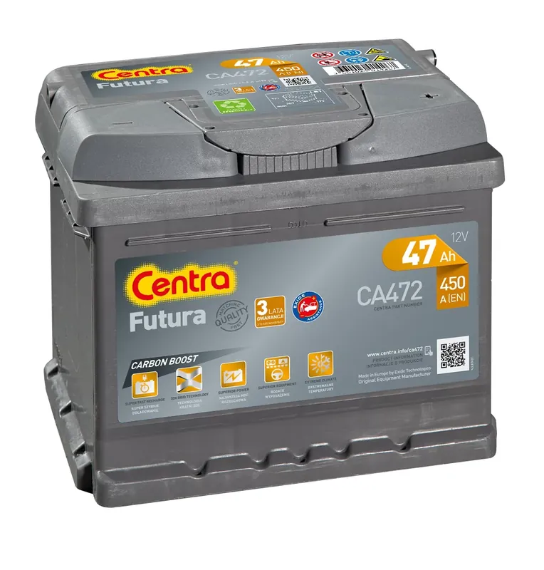 Test starego akumulatora orazparametrów nowego GRATIS. Futura została stworzona zmyślą onowoczesnych autach charakteryzujących się zwiększonym zapotrzebowaniem na moc rozruchową wynikającą ze specyficznego użytkowania samochodu (jazda na krótkich odcinkach, częste gaszenie silnika iponowny rozruch, parkowanie na wolnym powietrzu, auta zsilnikiem Diesla). Doskonałe parametry akumulatorów Futura pomagają uruchomić auto wpraktycznie wkażdych warunkach atmosferycznych, zdużymi wahaniami temperatur iinnymi niekorzystnymi czynnikami pogody. Poleca Petrostar. PARAMETRY TECHNICZNE: Akumulator Centra Futura 47[Ah] – CA 472 Poleca Petrostar Pojemność akumulatora: 47 [Ah] Nr. katalogowy: CA 472 Długość – 207 [mm] Szerokość – 175 [mm] Wysokość – 175 [mm] Polaryzacja: Prawy plus [P+] Napięcie: 12 [V] , prąd rozruchu: 450 wg EN [A] Waga/mocowanie : ok. 12,13 kg / B13 Zalety akumulatora Centra Futura: – najlepsze parametry rozruchowe. – najwyższy komfort ibezpieczeństwo. – konstrukcja wieczka STS lid -specjalnie zaprojektowana inowoczesna, zapobiega przed wyciekiem elektrolitu. – ochrona przed zapłonem – centralny system odgazowania chroni przed zapłonem spowodowanym czynnikami zewnętrznymi. – technologia Ca/Ca – dłuższy okres przechowywania bez konieczności doładowywania iutraty parametrów. – magiczne oczko (użyteczny wskaźnik stanu naładowania). – całkowicie bezobsługowe (wg normy EN). – pakiet Centra Assistance 3 lata gwarancji. Futura to akumulatory polecane kierowcom ceniącym bezpieczeństwo inajwyższy komfort użytkowania. Poleca Petrostar.