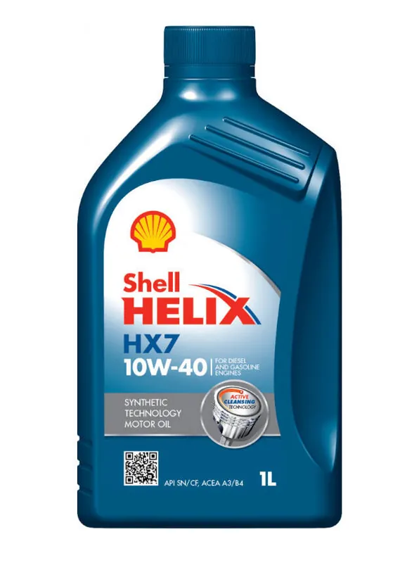Opis produktu i zastosowanieShell Helix HX7 10W-40 to olej silnikowy posiadający w swojej formulacji nowoczesne dodatki detergentowe. Ta zaawansowana technologia pozwala na dokładne i lepsze zabezpieczenie silnika przez powstawaniem osadów i szlamów w porównaniu ze standardowymi olejami silnikowymi. Doskonałe osiągi silnika, aż do następnej wymiany oleju.Właściwości i korzyściTechnologia dodatków detergentowych. Dwa razy efektywniejsze usuwanie osadów szlamów i laków z wnętrza silnika w porównaniu do standardowego oleju mineralnego.Dobra stabilność oksydacyjna. Do 19% lepsza odporność na utlenianie w porównaniu do innych olejów produkowanych w technologii syntetycznej.Niska lepkość, szybka płynność, niskie tarcie. Duża sprawność silnika.Odporność na ścinanie. Odpowiednia wartość lepkości kinematycznej oleju pozostaje na odpowiednim poziomie przez cały okres użytkowania do następnej wymiany.Wysoka jakość syntetycznej bazy olejowej. Znaczne zmniejszenie odparowalności oleju zmniejsza jego konsumpcję w trakcie użytkowania.Minimalizacja wibracji i wyciszenie pracy silnika. Cicha i stabilna praca silnika.ZastosowanieSilniki benzynowe i Diesla Pojazdy benzynowe z wtryskiem bezpośrednim wyposażone w recyrkulację „blow-by” oraz układ katalityczny.Turbo-doładowane jednostki Diesla z układem bezpośredniego wtrysku oraz chłodnicą dolotu powietrza i systemem recyrkulacji „blow-by” bez filtra cząstek stałych DPF.