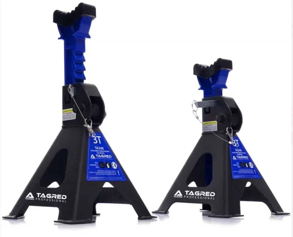 W skład zestawu wchodzą: 2x Kobyłki TA248 Kobyłki mogą utrzymać utrzymać przedmioty omasie do 3 ton. Wykonane są zwysokiej jakości materiałów: m. in. grubej, stalowej blachy. Posiadają mechanizm zapadkowy, który umożliwia bardzo precyzyjne ustawienie wysokości na wielu poziomach. Zalety Wysoka jakość Niezawodność Wytrzymałość Dane techniczne Model: TA248 Udźwig 3T (3000 kg) Wysokość minimalna 285 mm Wysokość maksymalna 425 mm Wymiary podstawy 180x190mm Waga 5 kg 2 kobyłki zblokadami zabezpieczającymi – PIN-ami oudźwigu do 3 ton Gumowe nakładki
