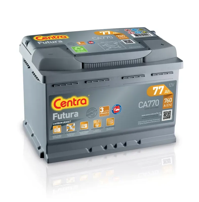 Test starego akumulatora orazparametrów nowego GRATIS. Akumulatory firmy Centra są zaliczane do światowej czołówki, potwierdza to uzyskanie wkwietniu 2005 r. przezpoznański zakład nagrody jakości Forda Q1. Potwierdzają to również certyfikaty takie jak: ISO 9002 iVDA 6.1 ( norma wymagana przezniemiecki przemysł samochodowy ). Wstyczniu 2001 roku Centra uzyskała certyfikat ISO/TS 16 949 iISO 14001 co potwierdza jakość isolidność produktów. Dzięki wdrożeniu, systemów zarządzania jakością iśrodowiskiem Centra dostarcza akumulatory do takich firm jak FIAT Auto Poland wTychach , JAGUAR wWielkiej Brytanii, TPCA czyli Toyota Peugeot, Citroen wKolinie na SŁOWACJI. NAPIĘCIE [V] : 12 PRĄD ROZRUCHU [A] : 760 POJEMNOŚĆ AKUMULATORA [Ah] : 77 DŁUGOŚĆ [mm] : 278 SZEROKOŚĆ [mm] : 175 WYSOKOŚĆ [mm] : 190 POLARYZACJA : P+