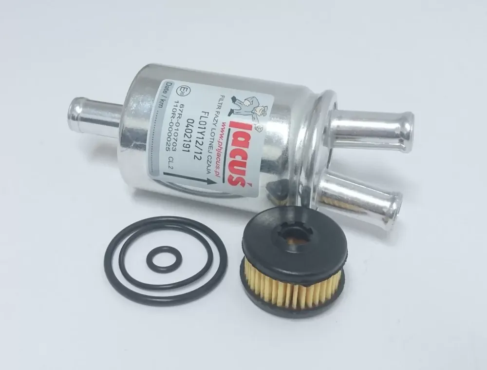 Zestaw składa się z: 1x JACUŚ CZAJA F47 FILTR FAZY LOTNEJ 1x VALTEK F60 FILTR FAZY CIEKŁEJ + ORINGI JACUŚ CZAJA F47 FILTR FAZY LOTNEJ Filtry stosuje się do instalacji sekwencyjnych, montowane są pomiędzy reduktorem, a listwą wtryskowa. Filtr należy wymieniać co ok. 10000km, gdyż przedłuża to żywotność listwy wtryskowej. Wymiary filtra: dł. całkowita: 115mm śr.: 45mm śr. króćców: 12mm VALTEK F60 FILTR FAZY CIEKŁEJ + ORINGI Bibułowy wkład filtra fazy ciekłej Valtek + oringi. Montowany jest welektrozawór gazowy montowany przed reduktorem. Wkład należy wymieniać co 10-15 tys. km lub raz na rok, gdyż przedłuża to żywotność układu gazowego. Wymiary filtra: śr. zew.: 31mm śr. wew.: 10mm wys.: ~21.5mm