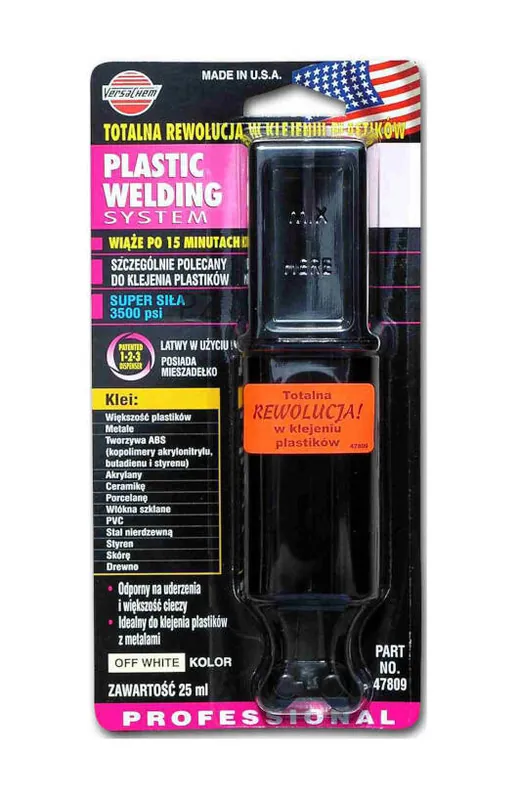 Opis produktu i zastosowanieNajlepszy na rynku klej do profesjonalnego łączenia wszelkiego rodzaju powierzchni, szczególnie plastików. Klienci, którzy raz kupili Plastic Welding nie szukają już innego kleju. Posiada unikalne składniki używane przy produkcji plomb dentystycznych, co pozwala uzyskać najwyższą jakość i trwałość wiązania. Łączy ze sobą „na zawsze” większość plastików i tworzyw sztucznych, metali a także ceramikę, porcelanę, włókno szklane, szkło, drewno i wiele innych materiałów.Zaczyna wiązać już po 4 minutach. Po 15 minutach można poruszać klejonymi przedmiotami. Pełną wytrzymałość uzyskuje już po 1 godzinie. Po 24 godzinach spoina wytrzymuje 238 atmosfer (246kg/cm2). W temperaturze poniżej +13° C czas utwardzania ulega wydłużeniu. Odporność temperaturowa od -40°C do +93°C. Jest wodoodporny. Doskonale wypełnia drobne szczeliny. Nie wiąże plastików wykonanych z polietylenu i polipropylenu. Przechowywać w temp. od +1°C do +24°C.