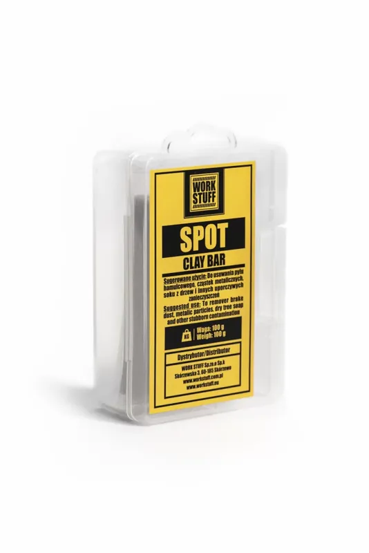 Work Stuff Spot Clay Bar – to najwyższej jakości glinka przeznaczona do oczyszczania lakieru. Najważniejsze cechy: Biały kolor ułatwiający kontrolowanie procesu oczyszczania Niezwykła efektywność Poręczne pudełko do przechowywania Waga: 100g Twardość: średnia