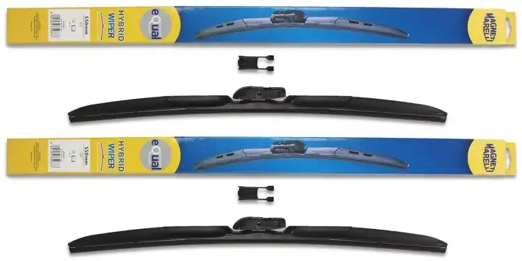 Wycieraczki są nowe – w oryginalnym opakowaniu producenta – cena zakupu dotyczy 1-kompletu (odpowiednio dobrane długości i modele wycieraczek – strona kierowcy oraz pasażera).  Wycieraczki hybrydowe Magneti Marelli wyprodukowane są z materiałów o najwyższej jakości:- guma – to ponad 50% kauczuku naturalnego z grafitową powłoką. Wewnątrz gumy znajduje się podwójna stal nierdzewna. Sztywne gumowe pióro z grafitową powłoką w wycieraczkach hybrydowych Magneti Marelli to skuteczne i dokładne wycieranie powierzchni szyby.- Spojler – materiał ABS- Złącze – materiał POMWycieraczki hybrydowe Magneti Marelli dzięki zastosowaniu materiałów najwyższej jakości oraz zaawansowanej technologii, bez problemu zastępują tradycyjne wycieraczki w starszych modelach samochodów. Wymiana wycieraczek jest łatwa i szybka.Wysokiej jakości materiał użyty w wycieraczkach hybrydowych Magneti Marelli sprawia, że są wytrzymałe, dobrze dopasowują się do powierzchni szyby, dzięki czemu ich praca jest cicha. Sprawdzają się również w niekorzystnych warunkach atmosferycznych; temperatura od – 25ºC do + 50ºC w żaden sposób nie zakłóca ich pracy.Wycieraczki hybrydowe Magneti Marelli pasują do większości modeli samochodów dzięki zastosowaniu jednego uniwersalnego adaptera, który może być montowany w czterech różnych wycieraczkach.Wycieraczki Magneti Marelli to jedne z bardziej poszukiwanych wycieraczek na świecie.