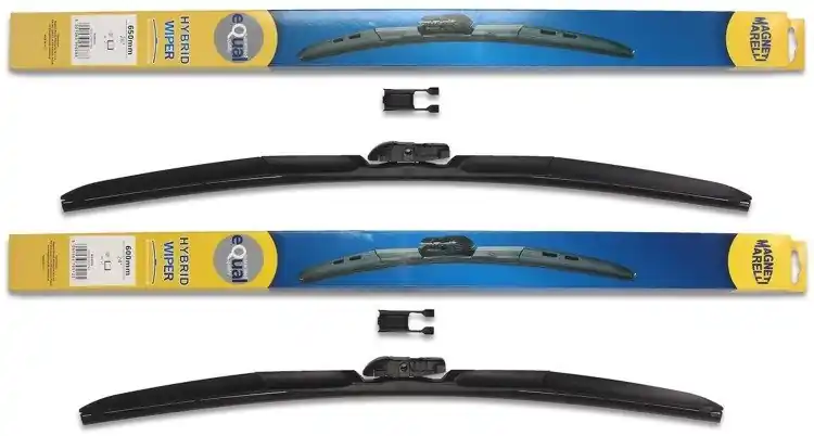 Wycieraczki są nowe – w oryginalnym opakowaniu producenta – cena zakupu dotyczy 1-kompletu (odpowiednio dobrane długości i modele wycieraczek – strona kierowcy oraz pasażera).  Wycieraczki hybrydowe Magneti Marelli wyprodukowane są z materiałów o najwyższej jakości:- guma – to ponad 50% kauczuku naturalnego z grafitową powłoką. Wewnątrz gumy znajduje się podwójna stal nierdzewna. Sztywne gumowe pióro z grafitową powłoką w wycieraczkach hybrydowych Magneti Marelli to skuteczne i dokładne wycieranie powierzchni szyby.- Spojler – materiał ABS- Złącze – materiał POMWycieraczki hybrydowe Magneti Marelli dzięki zastosowaniu materiałów najwyższej jakości oraz zaawansowanej technologii, bez problemu zastępują tradycyjne wycieraczki. Wymiana wycieraczek jest łatwa i szybka.Wysokiej jakości materiał użyty w wycieraczkach hybrydowych Magneti Marelli sprawia, że są wytrzymałe, dobrze dopasowują się do powierzchni szyby, dzięki czemu ich praca jest cicha. Sprawdzają się również w niekorzystnych warunkach atmosferycznych; temperatura od – 25ºC do + 50ºC w żaden sposób nie zakłóca ich pracy.Wycieraczki hybrydowe Magneti Marelli pasują do większości modeli samochodów dzięki zastosowaniu jednego uniwersalnego adaptera, który może być montowany w czterech różnych wycieraczkach.Wycieraczki Magneti Marelli to jedne z bardziej poszukiwanych wycieraczek na świecie.