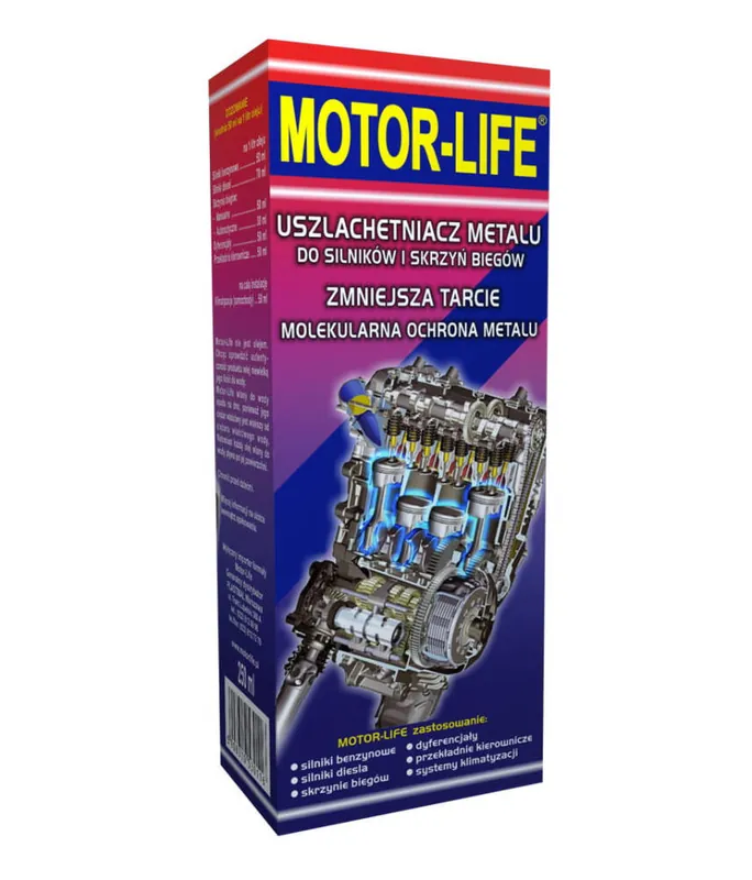 Opis produktu i zastosowanieMOTOR-LIFE najnowsze dzieło inżynierii molekularnej-molekularna ochrona metalu! Formuła środka została opracowana w laboratoriach wojskowych zgodnie z normami technologii militarnej. Preparat łączy się z metalem w miejscach, gdzie występuje tarcie. Jest uszlachetniaczem metalu, a nie tradycyjnym dodatkiem do poprawiania właściwości oleju. Olej jest tylko i wyłącznie nośnikiem preparatu. MOTOR-LIFE uszlachetnia i chroni powierzchnie metalowe przy pomocy stałego impregnowanego wiązania molekularnego (siatka molekularna).Stosowany w samochodach wyścigowych oraz jeżdzących w mieście, na obszarach o gęstym zapyleniu. Przeznaczony do redukcji tarcia w węzłach tarcia na styku metal-metal np. w silnikach. Dzięki unikalnej recepturze tarcie może być obniżone nawet o 300% w zależności od rodzaju trących metali.Między innymi eliminuje to suchy start silnika i wydłuża czas użytkowania elementów pracujących-narażonych na zużycie w wyniku tarcia.Nie zawiera PTFE i ciał stałych. Jest preparatem jednofazowym-występuje w nim tylko faza ciekła. W związku z tym nie istnieje ryzyko zatykania magistrali olejowych. Obniża tarcie łącząc się z metalem na poziomie molekularnym w węzłach tarcia w warunkach podwyższonej temperatury.MOTOR-LIFE zmieszany z dowolnym olejem silnikowym lub przekładniowym, syntetycznym bądź mineralnym, działa bezpośrednio na metal na poziomie molekularnym.Dodatkowym walorem produktu jest zapobieganie tzw. suchym startom. Jest dowiedzionym, że w trakcie rozruchu zimnego silnika ulega on przyspieszonemu zużyciu, ponieważ przez pewien czas pracuje z przewagą tarcia suchego. Uszlachetniacz pozostawia na częściach zimnego silnika zwiększoną warstwę graniczną. Start silnika następuje z poziomu tej warstwy, a więc nie zachodzi zjawisko suchego startu. Zjawisko suchego startu występuje w każdym silniku nie zawierającym uszlachetniacza metalu.W silniku, skrzyni biegów i innych podzespołach samochodu taki środek ma ogromną rolę do spełnienia, ponieważ elementów trących poddanym obciążeniom, pracującym początkowo w niskiej, a później w wysokiej temperaturze, jest bardzo wiele. W rajdach największe problemy sprawia utrzymanie sprawności turbosprężarki ( obroty rzędu 100’000/min).MOTOR-LIFE stosowany w najtrudniejszych warunkach rajdowych , przy ekstremalnych obciążeniach,sprawia , że praca turbiny jest niezawodna.Doskonałe efekty uzyskuje się dolewając MOTOR-LIFE także w innych podzespołach , w których występuje tarcie i temperatura , takich jak: skrzynia biegów , tylny i przedni dyferencjał , wspomaganie układu kierowniczego oraz klimatyzacja.MOTOR-LIFE nie zmienia plastycznych właściwości metalu, można więc metal poddać dalszej obróbce.MOTOR-LIFE wstrzyknięty pod osłonę gumową tłoczka hamulcowego zapobiega jego blokowaniu i korozji.MOTOR-LIFE zmiejszając tarcie, zwiększa żywotność części , zmniejsza zużycie paliwa i zwiększa moc silnika.