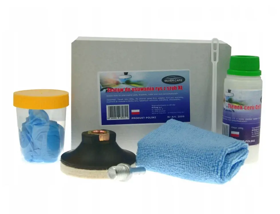 Zestaw zawiera : 1x Tlenek ceru 100g 1x Filc polerski M14 1x Adapter M14 pod wiertarkę 1x Pojemnik do mieszania 2x Rękawiczka ochronna 1x Mikrofibra ok 30x30cm 1x Mieszadełko Tlenek ceru to proszek wkolorze białym, kremowym lub lekko różowym przeznaczonym do polerowania szyb, a także do drobnych skaz na powierzchniach marmurowych, terakotowych ikamiennych. Z powodzeniem nadaje się do renowacji starych izabytkowych luster, kryształów, szyb samochodowych, reflektorów samochodowych, szklanych elewacji budynków, szkieł wzegarkach, lusterek samochodowych iwszelkich innych elementów wykonanych ze szkła iplastiku. Jest mniej inwazyjny idelikatniejszy niż proszek elektrokorundowy, czydiament. Zalety : – Usuwa rysy izmatowienia – Łatwe wużyciu – Nadaje pierwotną przejrzystość ipołysk szyby – Wysoka skuteczność iefektywność – Nie niszczy przedmiotów – jest delikatny imało inwazyjny Właściwości : – Przywraca przejrzystość na powierzchniach szklanych – Niweluje zarysowania po wycieraczkach, skrobaczkach, zmatowienia orazzacieki po twardej wodzie – Tlenek ceru jest koloru białego – niezawiera zanieczyszczeń Sposób użycia: Odmierz wymaganą ilość tlenku ceru Wymieszaj proszek zwodą wproporcji 1:1 Uzyskaną pastę nanieś na uszkodzoną powierzchnię szyby, szkła iprzy pomocy wiertarki, wkrętarki lub polerki orazfilcowego krążka polerskiego, który jest dołączony do zestawu, poleruj uszkodzoną powierzchnię szyby lub szkła Poleruj zprędkością 500-600 obrotów na minutę. Kontroluj, aby pasta niebyła sucha. Wtrakcie polerowania możesz spryskiwać szybę wodą, aby nawilżyć polerowaną powierzchnię. Również filc polerski zwilż wodą. Aby uzyskać jak najlepszy efekt, poleruj szybę równomiernie
