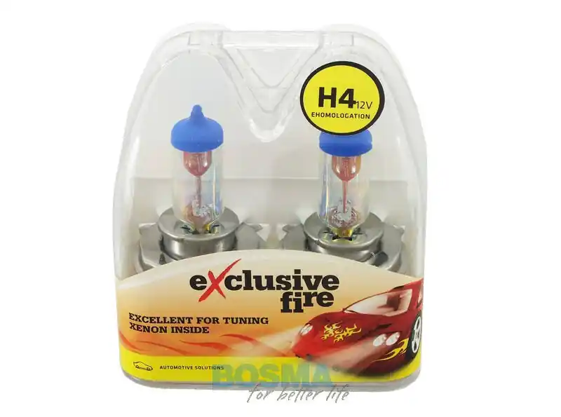 Opis produktuKolekcja żarówek Exclusive Fire nadaje pojazdom charakterystyczny wygląd, wyróżnia je na drodze. Parametry świetlne tych żarówek powodują zdecydowaną poprawę widoczności podczas jazdy w trudnych warunkach atmosferycznych.CharakterystykaWykonane ze szkła kwarcowego o zabarwieniu tęczowym w technologii UV-block.Wypełnione halogenem i ksenonem.Niebieski wierzchołek bańki szklanej pozwala na stosowanie tych żarówek w reflektorach z przezroczystego szkła, bez pogorszenia wrażeń estetycznych.
