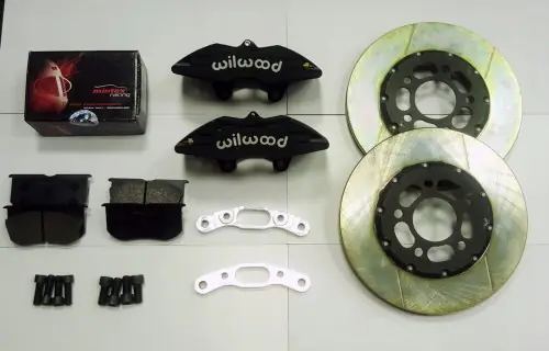 Po dość długich i intensywnych testach możemy już z pełną odpowiedzialnością zaprezentować zestawy hamulcowe opracowane do samochodów evo 6-9 oraz do evo 10 / proto. Zestaw hamulcowy opracowany do samochodów: Mitsubishi Lancer Evo 5-9 oraz 10 Zestaw jest opracowany pod rajdy szutrowe i felgi minimum 15 cali. Testowane spasowanie na felgach Braid Compomotive Arcasting W skład zestawu wchodzą: zaciski Wilwood 4 tłoczkowe, z kutego aluminium, z wewnętrznymi kanałami, tłoczki bez uszczelnień zewnętrznych tarcze 2 częściowe 296x30mm – tak opracowane że można zamiennie używać z tańszymi jednoczęściowymi dzwony z aluminimum 7075 anodowane na kolor czarny śruby AP Racing jarzmo wykonane z aluminium 7075 anodowane na kolor biały klocki hamulcowe Mintex F6R (lub inne do wyboru) śruby montażowe klasy 12.9 Wszystkie tarcze hamulcowe są zabezpieczone antykorozyjnie warstwą cynku nadając im charakterystyczny kolor. Tarcze dwuczęściowe skręcane (sztywne – nie pływające!). Tarcze skręcamy śrubami AP RACING. Podana cena jest za kompletny zestaw na przednią oś gotowy do montażu na samochodzie. Istnieje także możliwość zamówienia tarcz z systemem pływającym AP Racing – w tej sprawie prosimy o kontakt. Przed zakupem prosimy o kontakt w celu odpowiedniego dobrania zestawu do Państwa samochodu oraz w celu sprawdzenia czasu realizacji. Jeden taki zestaw (zarówno do evo 5-9 i evo 10) mamy dostępny od ręki!